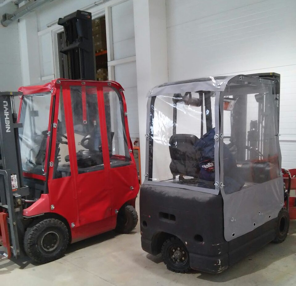 Работа на вилочных погрузчиках без кабин является достаточно сильной угрозой болезни сотрудников со многими неприятными последствиями. Наличие кабин способно защитить от холода и ветра, от пыли и снега. Мягкие кабины достаточно прочные и ударостойкие. Также мягкие кабины очень удобные в использовании, так как для их демонтажа нужно намного меньше времени в отличие от поликарбонатных или