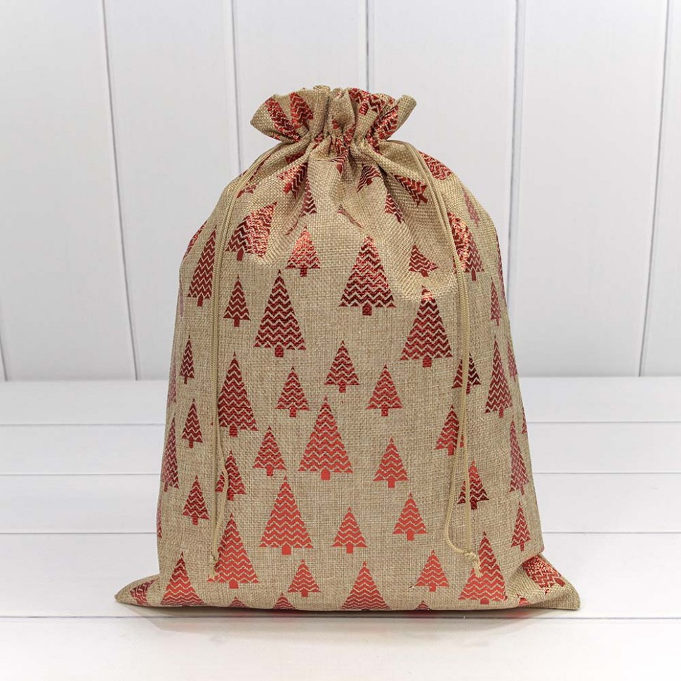 Мешочки из искусственного льна 30*40 с рисунком Ёлки красный